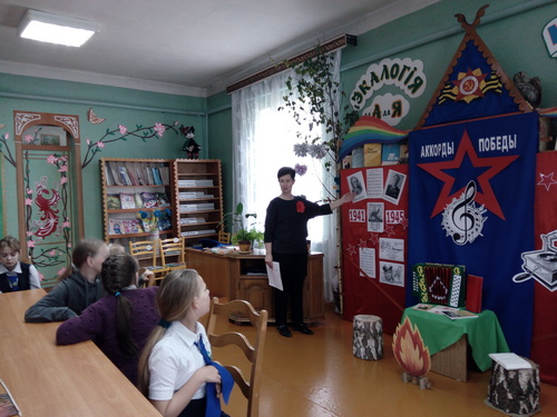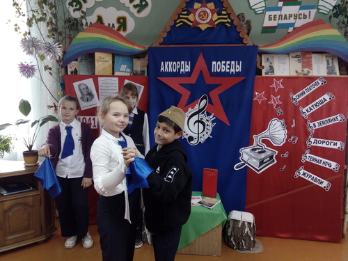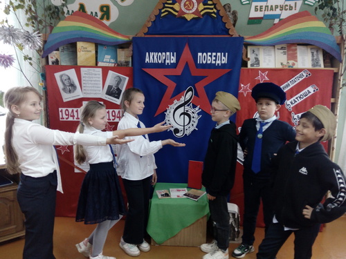 В канун Дня Победы в Великой Отечественной войне в филиале «Озерщинская библиотека семейного чтения» прошёл вечер фронтовой песни «Аккорды Победы». Библиотекарь познакомила участников мероприятия с историей создания песен «Священная война», «Катюша», «Смуглянка», «Землянка», «Синий платочек», «Темная ночь», «Журавли». Ребята не только прослушали песни в записи, но и хором подпевали знакомые мелодии, танцевали под них, а некоторые песни и инсценировали.